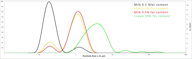 La leche es básicamente una emulsión de aceite en agua, pero también contiene partículas sólidas. Las partículas sólidas consisten en caseína y otras proteínas. Tienen un diámetro relativamente constante de unos 100-200nm. En cambio, las gotitas de grasa se distribuyen en la leche cruda en una gama de tamaños mucho más amplia (de 0,5µm a aproxidamente 10µm). La limitación de este espectro y la reducción de los diámetros de las gotas se consigue mediante la homogeneización. La homogeneidad es un componente esencial para el tratamiento posterior. La medición de partículas mediante diffracción láser permite verificar en dos minutos si el proceso se ha realizado correctamente o si la homogeneización tiene algún error.