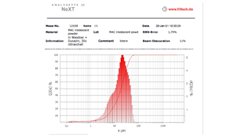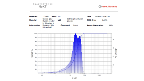 En el segundo experimento, el polvo de maquillaje más barato se analizó también en el ANALYSETTE 22 NeXT, con el aditivo surfactante (Dusacina) poco dispersable en agua. Las malas propiedades de dispersión del producto indican una superficie áspera de las partículas que hace que el polvo se extienda de peor manera sobre la piel.