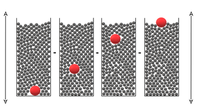 • „Lugar incorrecto para la toma de muestras": La muestra suele tomarse sólo de la parte superior o de lugares de fácil acceso, en vez de considerar la muestra en su conjunto. La inercia, la convección o la flotabilidad pueden provocar una segregación de la muestra. Por ejemplo, puede producirse el llamado efecto nuez de Brasil debido al transporte de muestras. Dependiendo de la densidad, la forma, las propiedades de la superficie, la orientación y las influencias externas (por ejemplo, la energía cinética), se crean cavidades durante un breve periodo de tiempo que son ocupadas por pequeñas partículas. Como las partículas más grandes no pueden ocupar estas cavidades, prácticamente migran hacia arriba (imagen 2). El efecto de nuez de Brasil inverso, entonces, la sedimentación de las partículas grandes hacia el fondo de la muestra, también se observa con parámetros adecuados.