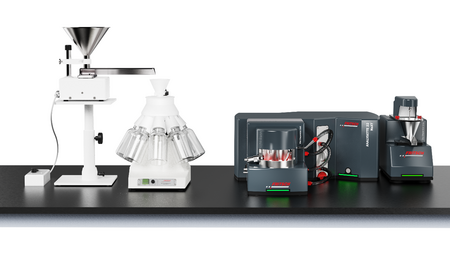 Imagen 4: Combinación de alimentador vibratorio LABORETTE 24 y divisor de muestras de cono giratorio LABORETTE 27 (izquierda) y ANALYSETTE 22 NeXT para el análisis de la distribución granuométrica mediante dispersión de luz estática (derecha).