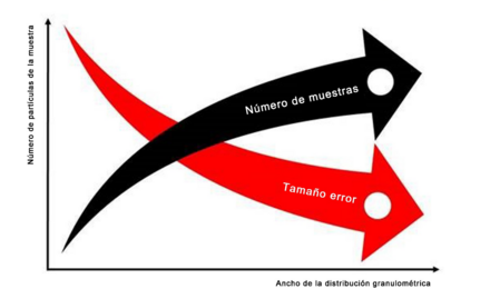 El objetivo de un muestreo correcto es minimizar las desviaciones en los análisis. No obstante, incluso las muestras bien mezcladas están sujetas a variaciones estadísticas. El valor en torno al valor medio, denominado intervalo de confianza, en el que se sitúa el valor verdadero buscado con una prohabilidad determinada, sólo puede optimizarse aumentando el número de submuestras. La magnitud del error estadístico del muestreo depende principalmente del tamaño de la muestra y de la amplitud de la distribución granulométrica. Cuanto menos partículas contenga la muestra y más amplia sea la distribución granulométrica, mayor puede ser el error. Por este motivo, el número de submuestras caracterizadas debería aumentar con el incremento de la heterogeneidad de la muestra total (imagen 3).