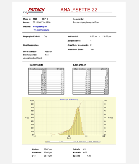 The shown below particle size distribution of hollow glass spheres was achieved with the ANALYSETTE 22 (maximum measuring range: 0.1 – 2100 μm). Performed was the measuring with the use of the dry dispersion unit with an adjusted pressure at the Venturi injectors. Covered was the measuring range from 0.85 up to approximately 116 μm. During the evaluation of the measuring data the Mie-theory was applied, since especially in the area of smaller particle diameters for samples with a small refractive index, an already significant deviation of the calculation according to Fraunhofer is recognizable. For a comparison, also a distribution curve from the Fraunhofer approximation was drawn into the diagram.