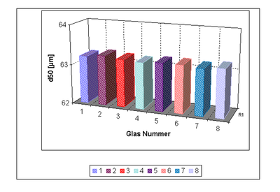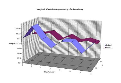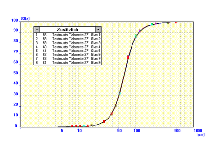 The median average of the 8 reproducibility measurements is x = 63.1925 ± 0.012 [μm], whereas the median average of the individually measured samples in the 8 sample containers is x = 63.1975 ± 0.027 [μm]. The comparison illustrates that the accuracy of the analyser is naturally considerably higher than the accuracy after sample division. Nevertheless, it is clearly evident that the systematic error caused by the LABORETTE 27 is very small indeed.
