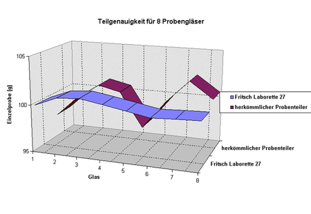 A mixture consisting of about 800 g of quartz sand was created and divided. Figure 1 compares the FRITSCH Rotary Cone Sample Divider with a rotary sample divider with local feeding directly over the sample containers. To attain the same ratios, the dividing cone for eight 500 ml sample containers was used. A check of equal division of samples to the sample containers showed that the LABORETTE 27 is clearly superior to conventional sample dividers.