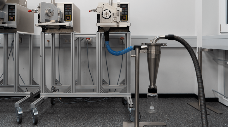 El PULVERISETTE 19 estaba equipado con el rotor estándar con bordes de corte en forma V de acero inoxidable endurecido, así como un casete de tamiz con orificio cuadrado de 2 mm. Para obtener una mejor performance el ciclón de alto rendimiento de acero inoxidable se conectó con el equipo. Después de 40 segundos, se trituraron 13 gramos de la muestra textil. El tiempo de procesamiento de la falda y la camiseta fue de 2 minutos para un rendimiento de 105 gramos de material molido. Cabe señalar que el volumen del material molido es aproxidamente un 30 % más alto que el de la muestra original, debido al cambio estructural de las partículas. El residuo en la cámara de trituración fue del 5 al 10 % de material de muestra.