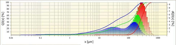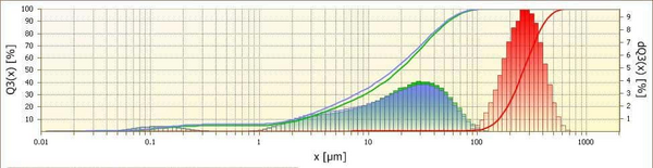 Las mediciones de la distribución del tamaño de las partículas se realizaron con el analizador láser ANALYSETTE 22. Con la dispersión de luz estática se pueden determinar .de forma muy rápida y eficaz distribuciones granulométricas en el rango comprendido entre 10 nm y 2 mm.
