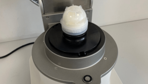En nuestra última prueba de molienda, Fabian Mayer eligió su mezcla favorita. Para producir una cantidad mayor de esta mezcla de 400 ml utilizamos un envase de un solo uso de 100 ml. Programamos un SOP con un tiempo de pausa de tres segundos cada uno a la velocidad máxima (14.000 rpm) y un tiempo de pausa de un segundo. El recipiente se llenó un total de cinco veces. Aquí la adherencia era muy baja y la muestra podía cepillarse completamente.