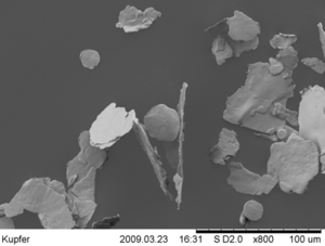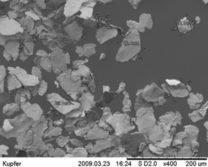 This can be easily discerned in the following images which were obtained with an electron microscope. With a platelet thickness of ~2 µm. the measurement in longitudinal respectively cross direction is approximately 20 - 40 µm.