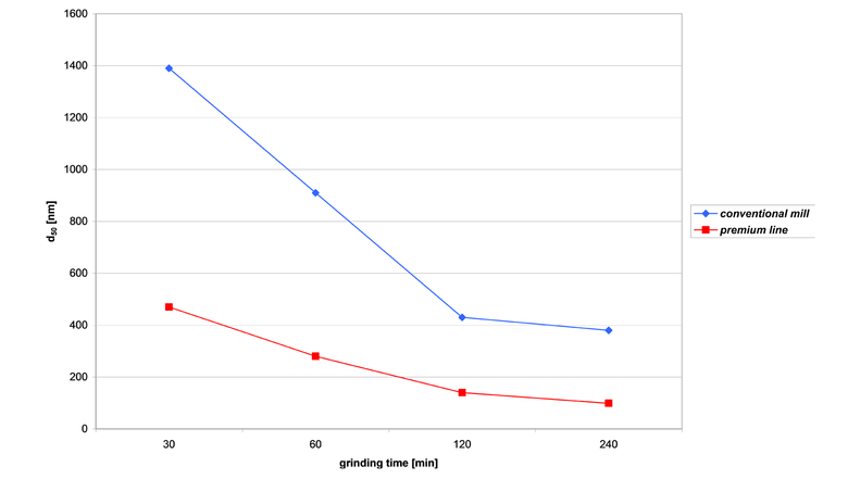 The d50 value of the initial material was 21 μm. After only 60 minutes of grinding with the FRITSCH premium line, the d 50 value of the particle size distribution was under 300 nm. This value is not reached with the conventional planetary mills even after 240 minutes. At the end of the test series (240 minutes), a d50 value for particle size distribution of 99 nm was achieved with the new premium line. To generate still smaller particles, we recommend using even smaller grinding balls in a following step.